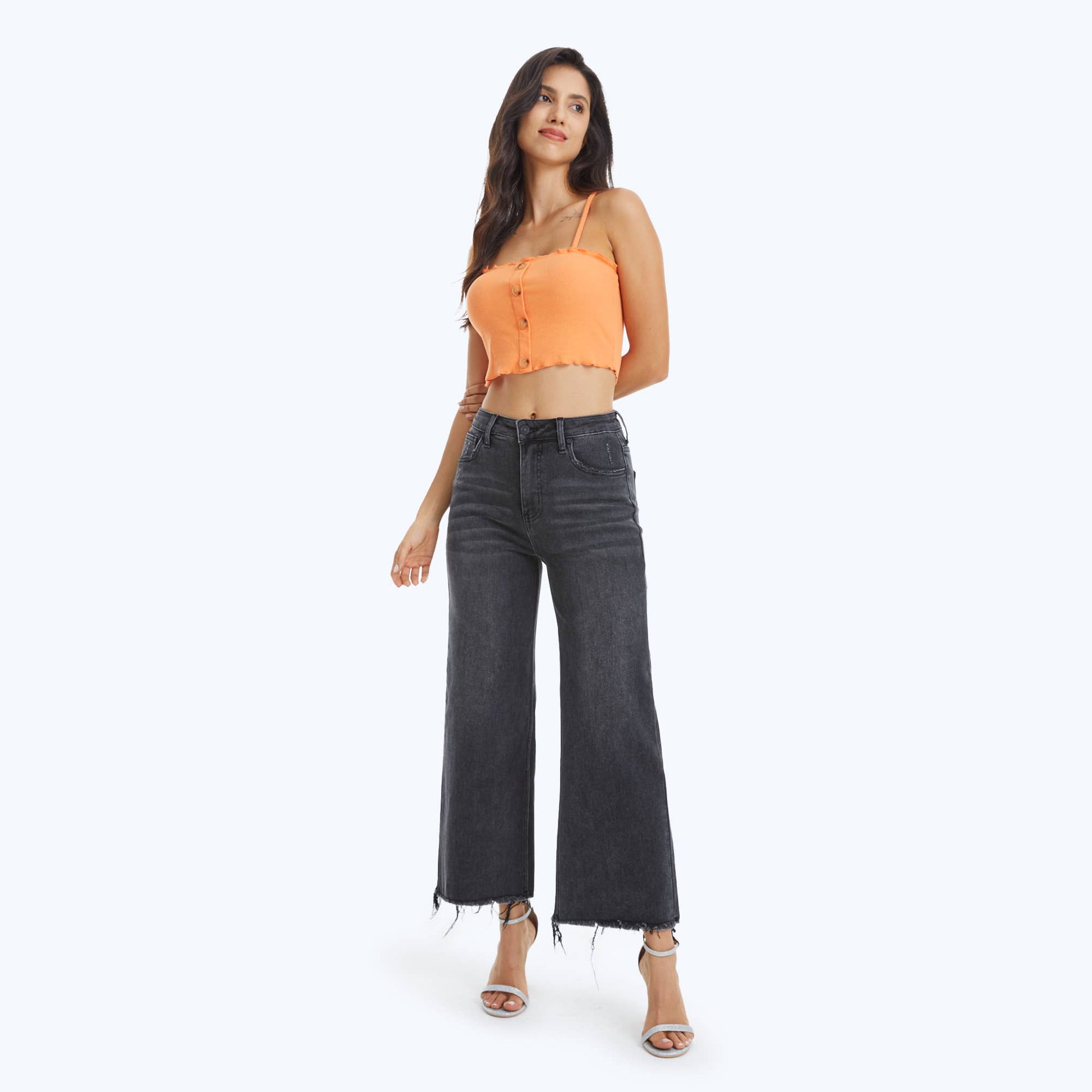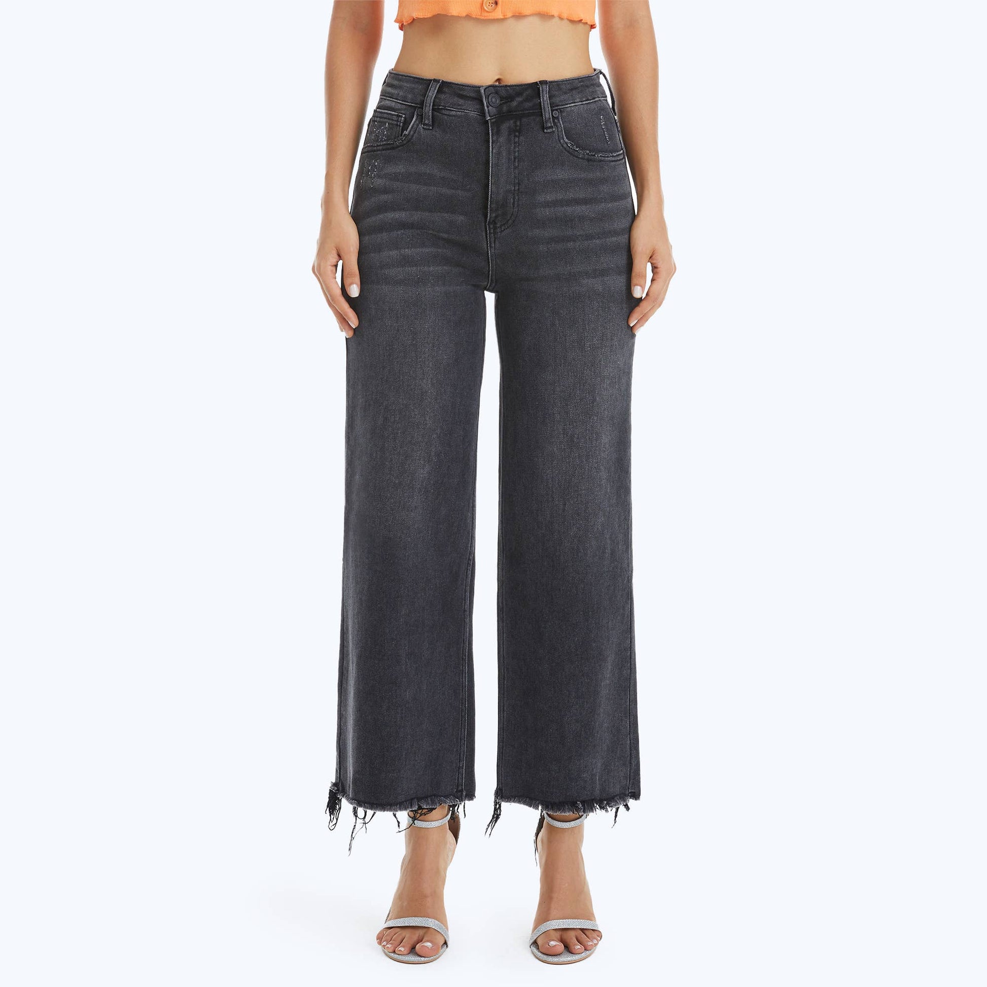 HIGH RISE WIDE LEG JEANS WITH FRAYED HEM: WASHED BLACK