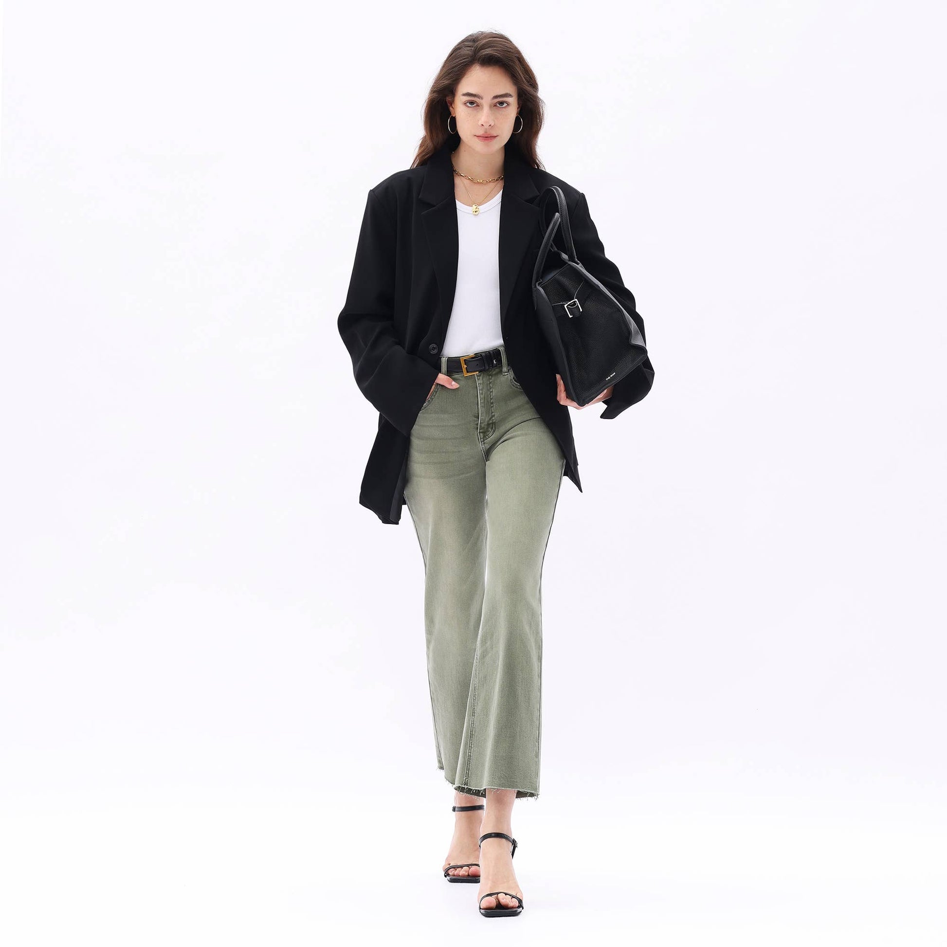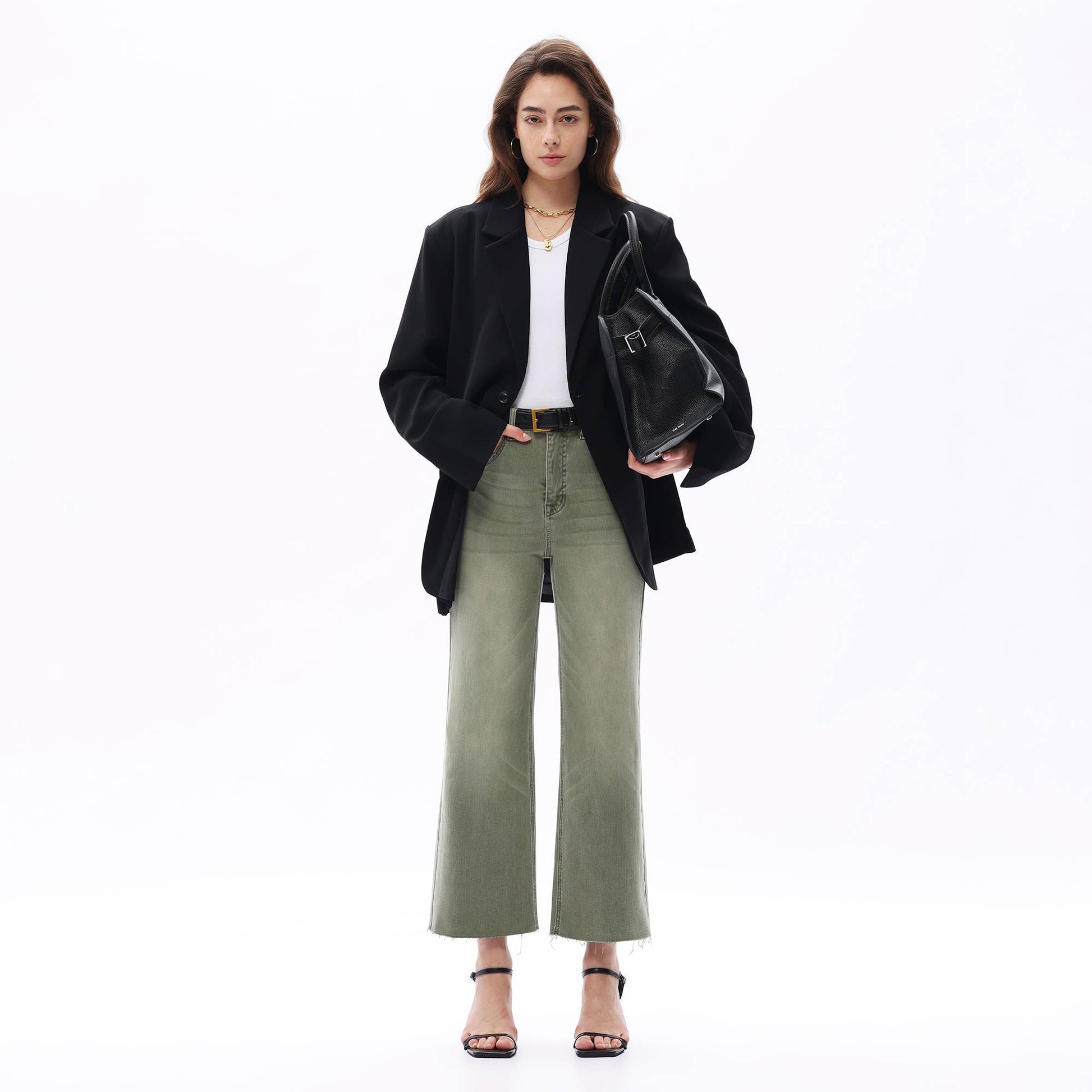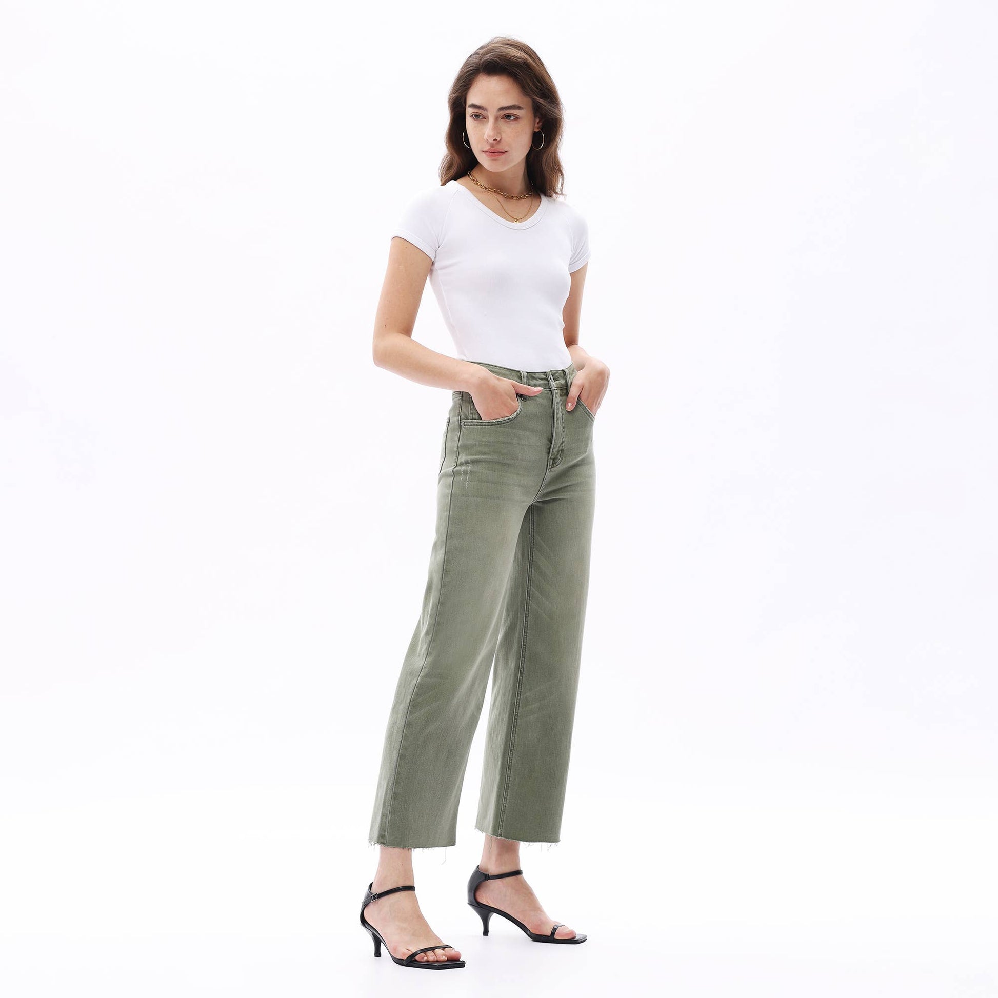 HIGH RISE WIDE LEG PANTS WITH RAW HEM : GREEN