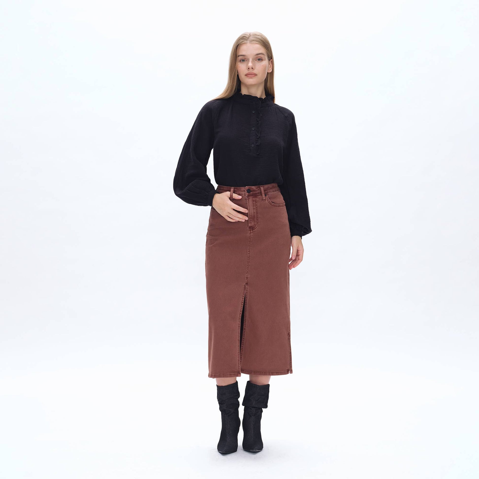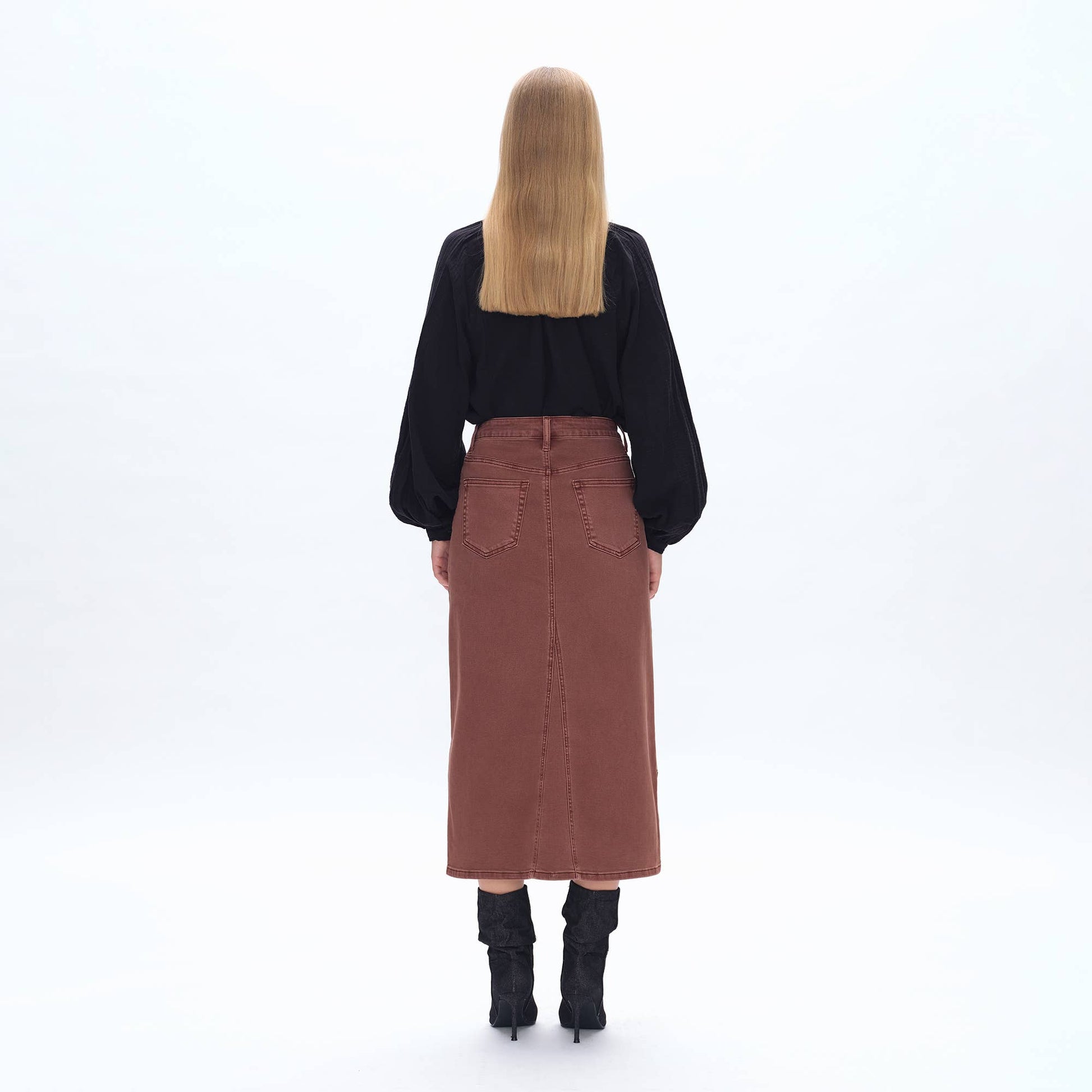 CRAFTED FROM SUPER STRETCH TWILL CAPPUCCINO(BROWN) FIVE POCKETS, ZIPPER FLY, PENCIL STYLE, SLIT DESIGN, GARMENT DYED, FINISHED HEM, TWILL SKIRT